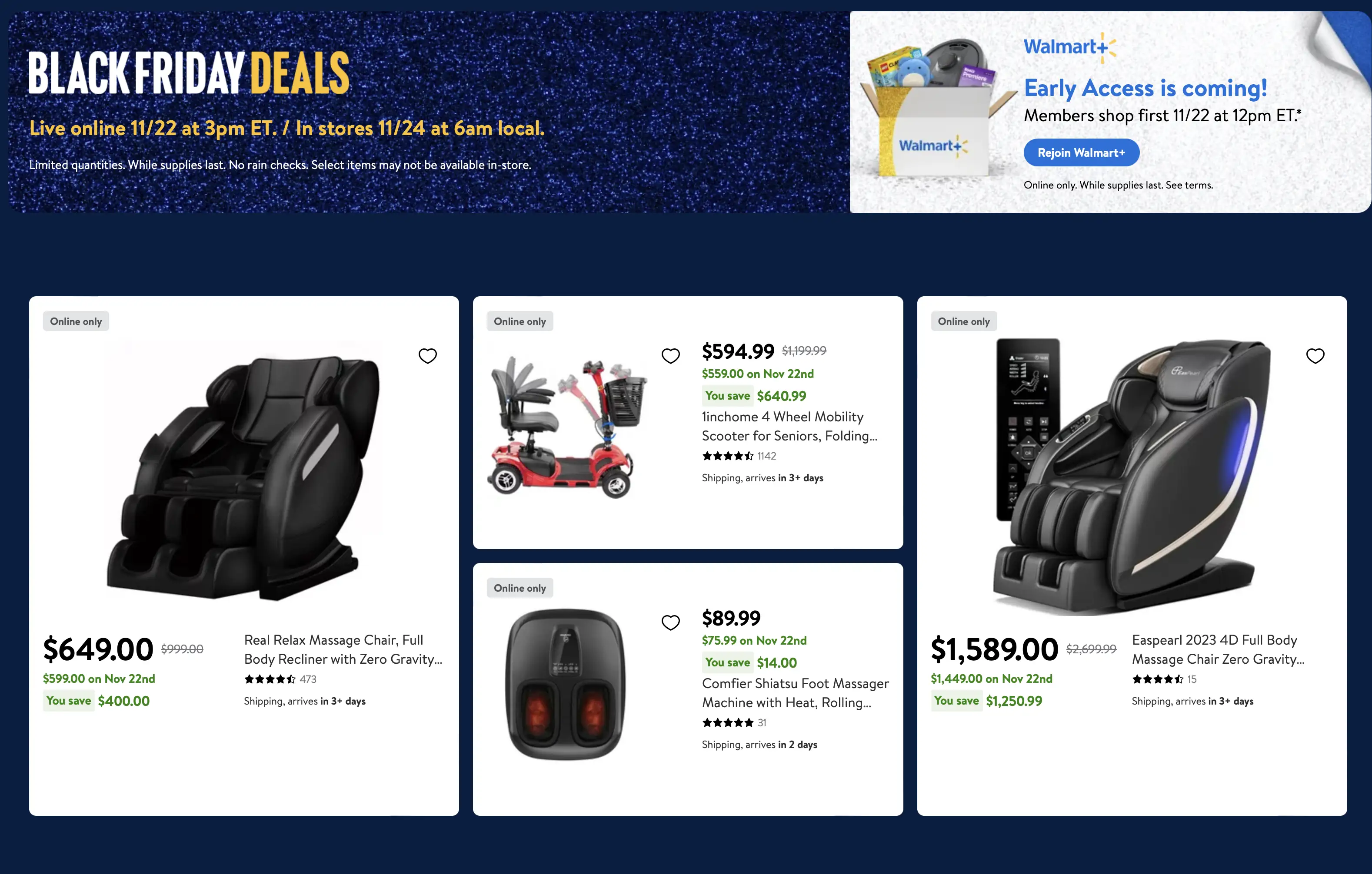 Q: What are the special perks of being a Walmart+ member during the Walmart Black Friday event? A: As mentioned in the Walmart Black Friday ad, Walmart+ members will gain access to the deals 3 hours early (online) on November 22nd, 2023 @ 12 p.m eastern standard time. The general public (non members) will get access to the deals @ 3 p.m. eastern standard time that same day.