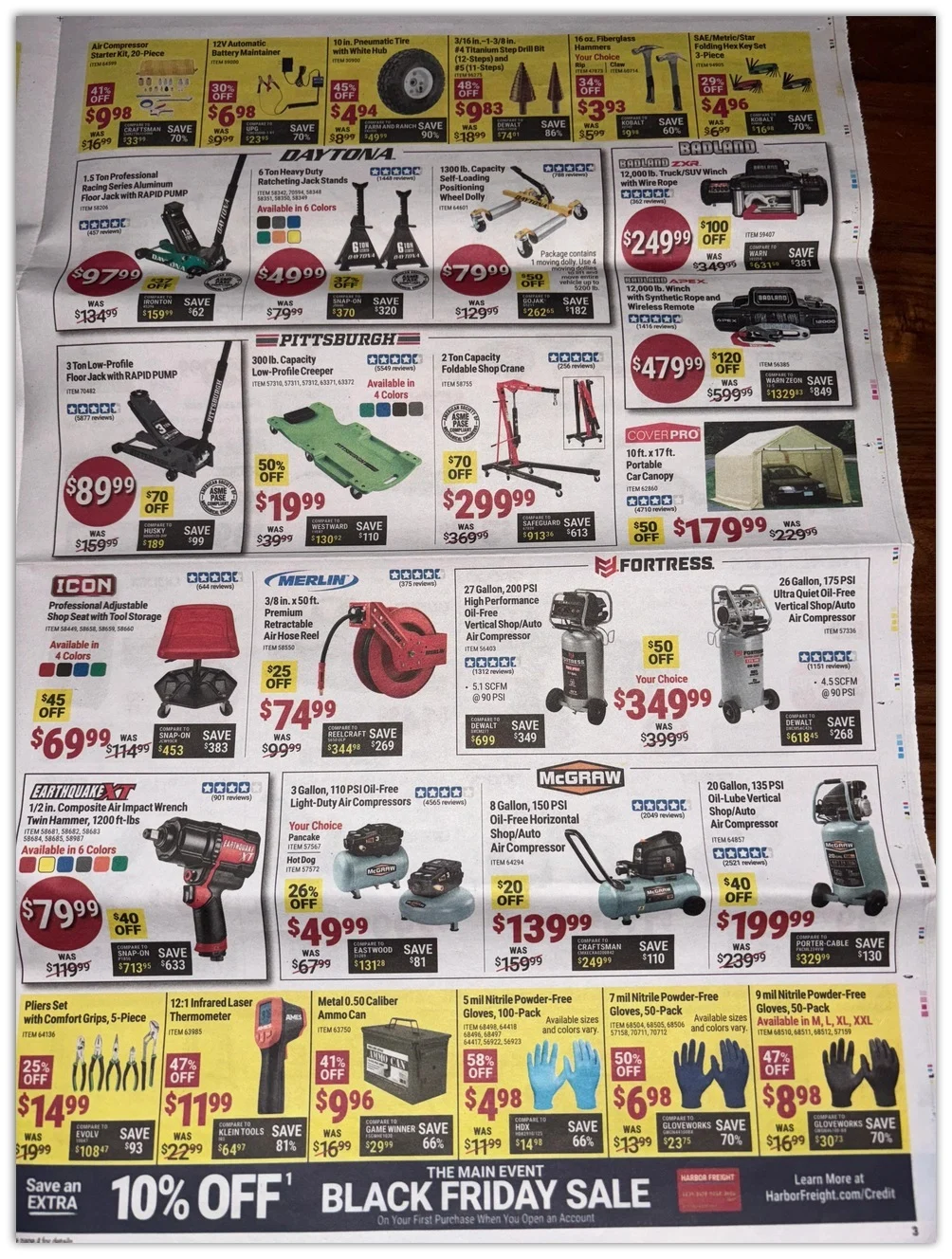 Check out the 3 Ton floor jack for just $89 bucks – you really can’t beat that! Also on this page some great air compressors to take your shop up a notch! And, who couldn’t use more gloves to keep the mess off the hands – at under $5 bucks for a hundred pack, these babies will sell themselves! Keep reading, we have so much more to show you from the 2024 Harbor Freight Black Friday Ad!