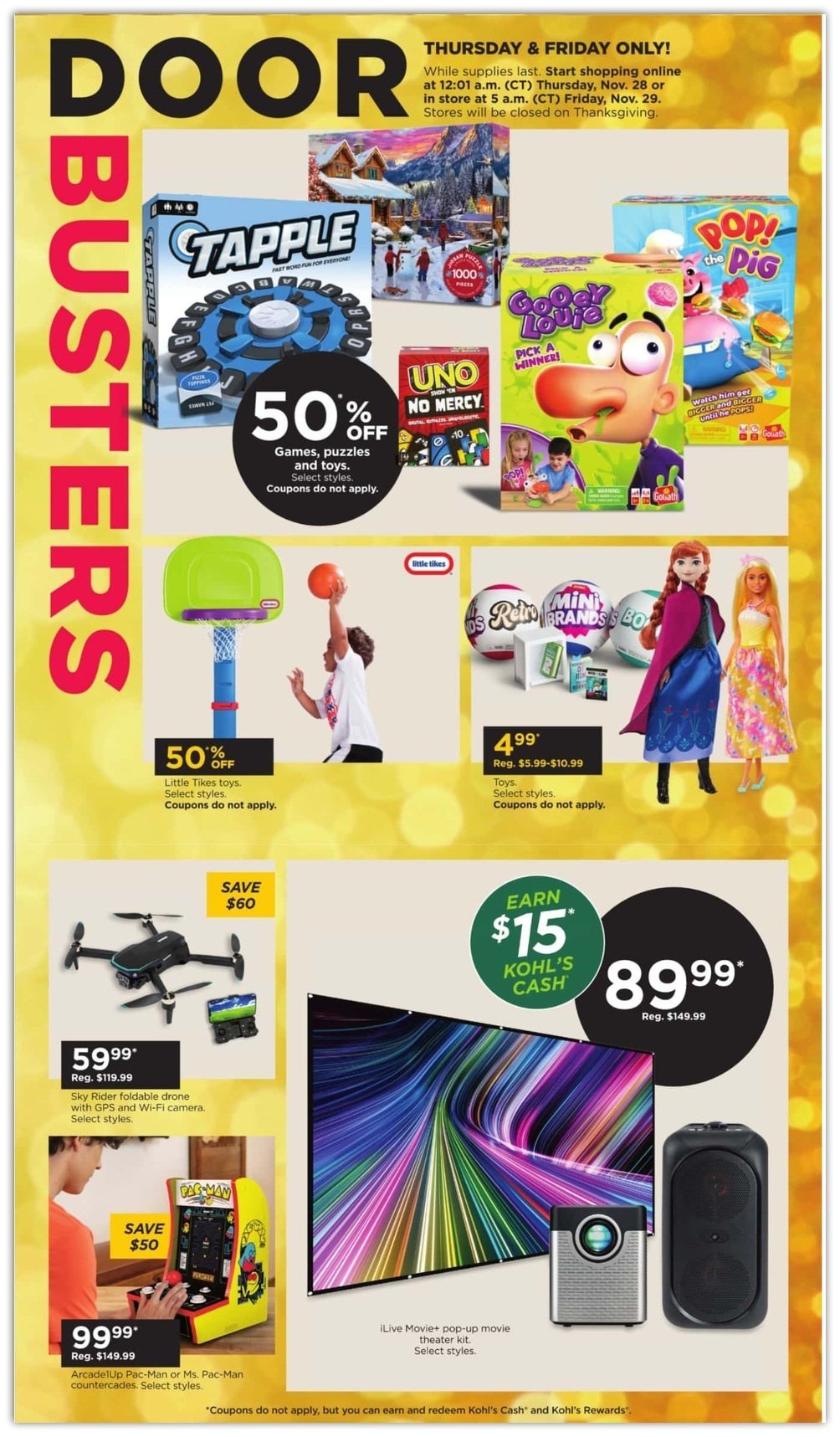 Shop in store and online Nov. 24 through Nov. 29th, 2024 + Take an extra 15% off + earn $14 Kohl's cash for every $50 spent! Door Busters Friday the 29th @ 5AM CT in stores on Black Friday. - Kohl's Thanksgiving Day Event: