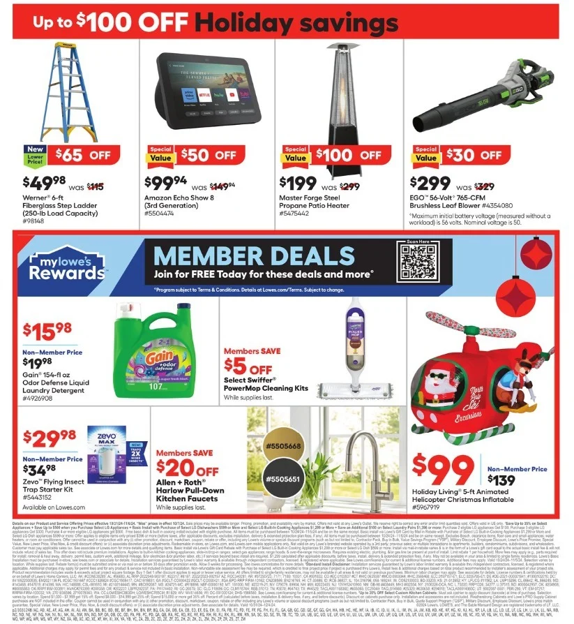 The last page of the 2024 Lowes Pre-Black Friday ad does not disappoint! Check out that very nice fiberglass ladder for just $49 bucks – you really can’t beat that! And a very good deal on the latest Amazon Echo Show 8 for $50 bucks off, so you can snag it for under a C-note! Well that’s it for this amazing Black Friday ad folks – checkout our home-page for all the other epic 2024 Black Friday and Cyber Monday ads as they drop!